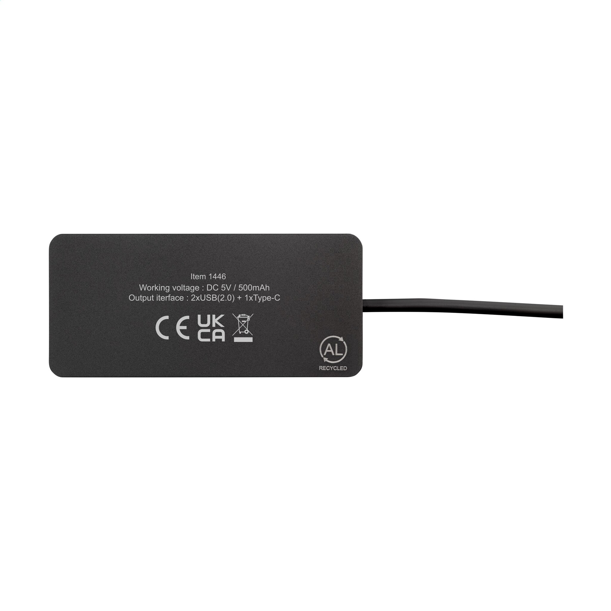 Compacte, lichte 2.0 USB hub. De behuizing is gemaakt van 100% GRS-gecertificeerd gerecycled aluminium. Voorzien van 3 USB-poorten: 1 USB-A 2.0 poort en 2 Type-C poorten voor het verbinden van additionele apparaten. Met een zwarte matching kabel voorzien van een dual input connector die geschikt is voor zowel type-c als USB-A computers. Totaal gerecycled materiaal: 50%. Door het gebruik van gerecycled aluminium worden er minder nieuwe grondstoffen gebruikt tijdens de productie van dit product. Dit betekent minder energieverbruik en minder gebruik van water. Per stuk in doosje.