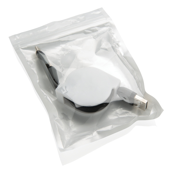 Compacte en oprolbare 3-in-1 oplaadkabel met type C en dubbelzijdige connector voor iOS- en Android-apparaten die micro-USB vereisen. Dankzij het rolmechanisme kan de 100 cm lange platte kabel gemakkelijk worden meegenomen zonder dat deze in de knoop raakt. ABS behuizing met TPU-kabel. Ook geschikt voor synchroniseren.