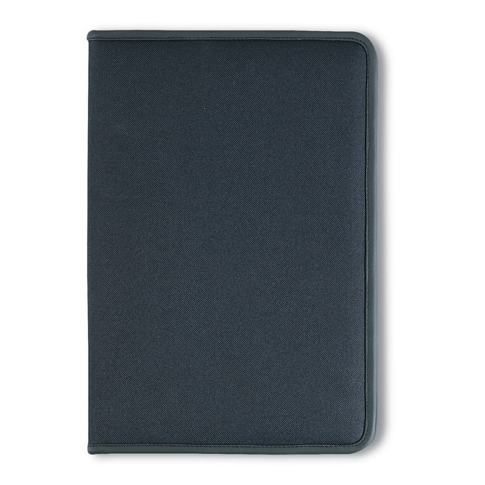 Specificaties: afmeting 36 x 25 x 2,2 cm, materiaal 600D polyester met 210T voering, A4-formaat, ritssluiting, vier binnenvakken, visitekaarthouder, inclusief schrijfblok met 20 vellen, drukformaat 200 x 300 mm.