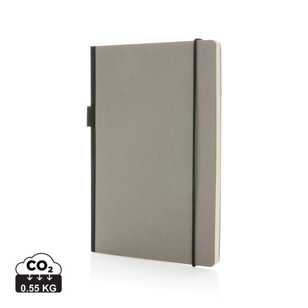 Dit FSC deluxe notitieboek met harde kaft heeft een FSC-gecertificeerde papieren omslag met zwarte accenten, bijpassende elastische pennenlus en lint. Aan de achterkant vind je een vakje om je losse notities in op te bergen. 80 vellen/160 pagina's crème, FSC -gecertificeerd gelinieerd papier.