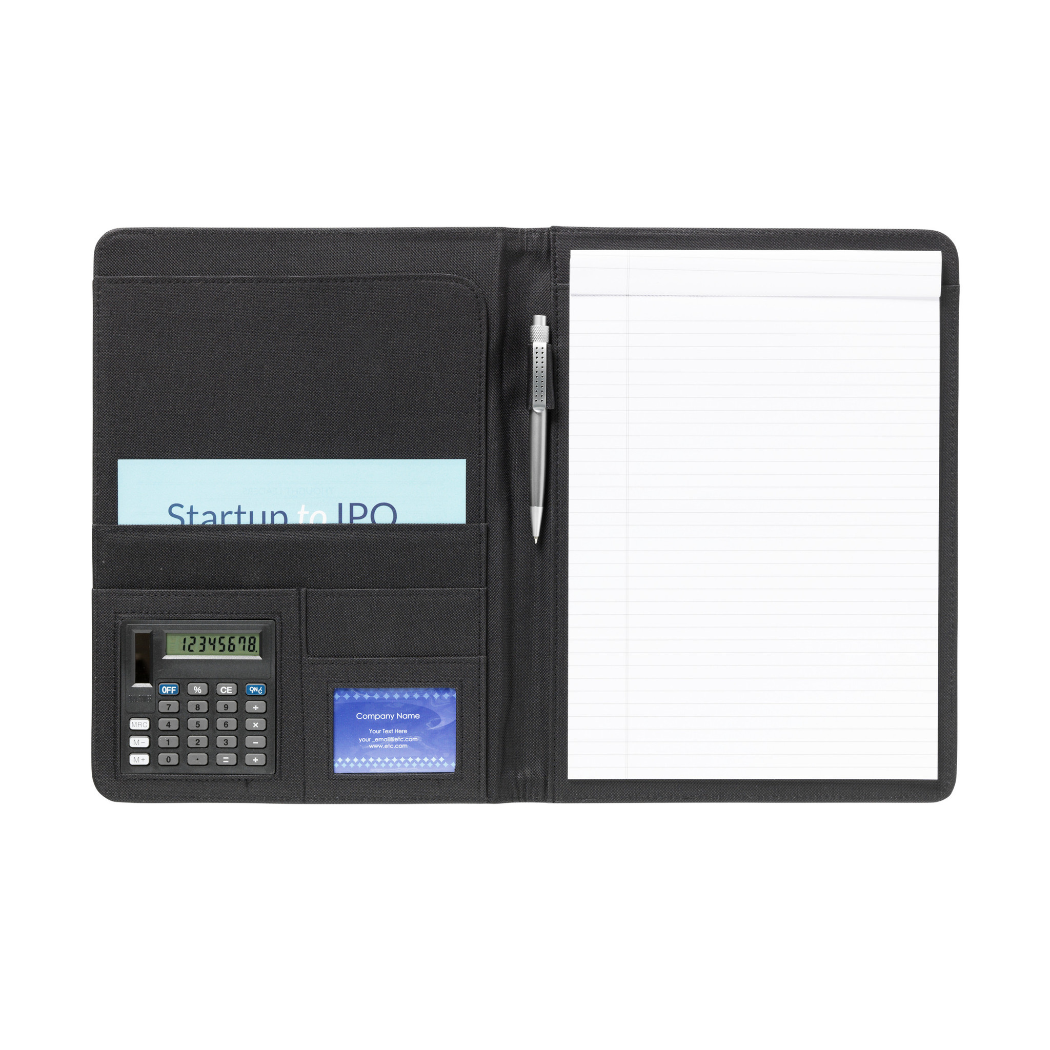 Specificaties: A4-formaat, materiaal 600D polyester met imitatieleer, schrijfmap en documentenmap, uitneembare solarcalculator met dual power inclusief celbatterij, inclusief schrijfblok en balpen, druktechniek zeefdruk, drukformaat circa 90 x 40 mm, maximaal 1 drukkleur.