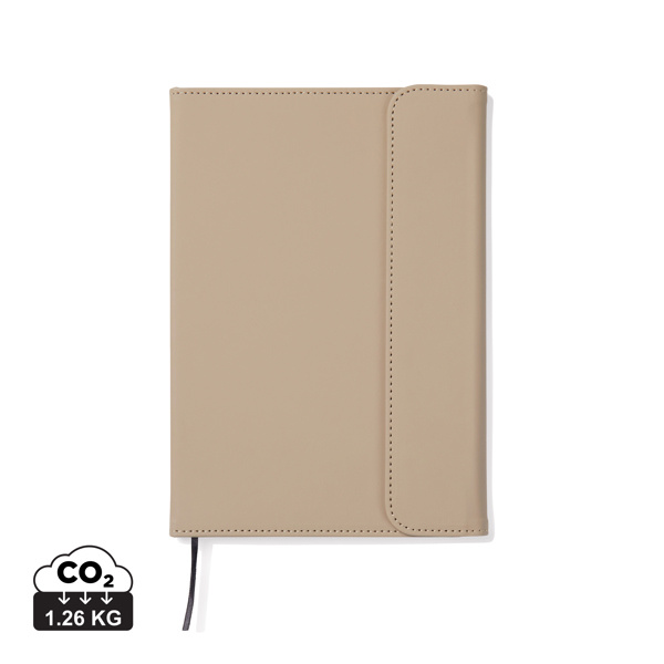 Formaat: 16 x 2 x 22,5 cm. Materiaal: gerecycled PU en gerecycled papier. Inhoud: 80 pagina’s, 160 gelinieerde vellen, 70 g/m². Eigenschappen: magnetische sluiting, penhouder, vervangbaar binnenwerk, GRS-gecertificeerd. Gebruik: vergaderingen, notities, kantoor, opleidingen. Personalisatie: bedrukking met logo op de omslag.