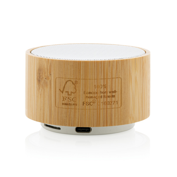Formaat: 4,3 x ø 7,4 cm. Materiaal: FSC® bamboe en gerecycled ABS. Eigenschappen: draadloze Bluetooth 4.1 verbinding, geïntegreerd lampje, microfoon, bereik tot 10 meter en speeltijd tot circa 3 uur. Gebruik: muziek afspelen en handsfree bellen op kantoor, thuis of onderweg. Personalisatie: CO₂-gravering op de voorzijde van het artikel met een drukformaat van 30 x 25 mm.