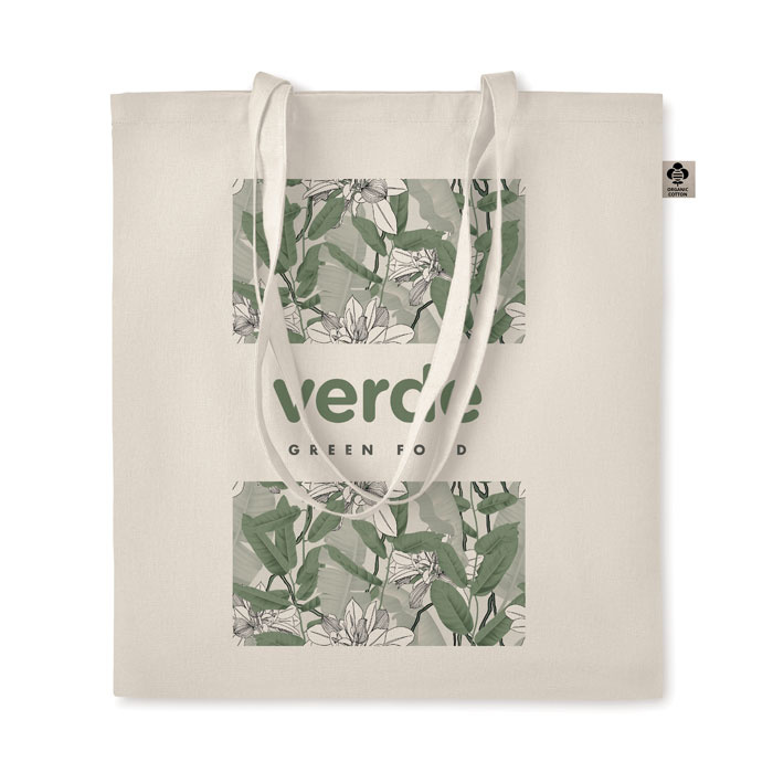 Met een formaat van 38 bij 42 centimeter is er voldoende ruimte voor boodschappen, documenten of promotiemateriaal. De lange hengsels zorgen voor comfortabel dragen in de hand of over de schouder, ook wanneer de tas wat zwaarder wordt beladen. Het natuurlijke materiaal geeft de tas een rustige en professionele uitstraling die past bij organisaties die duurzaamheid serieus nemen.