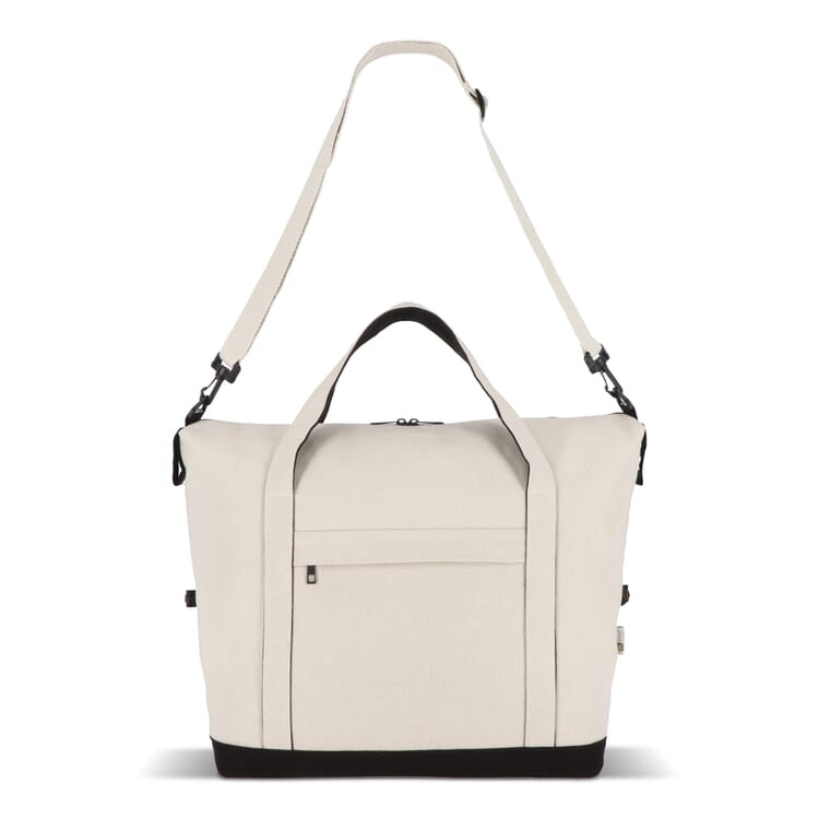 Formaat: 320 x 600 x 200 mm Materiaal: 70% gerecycled katoen en 30% gerecycled polyester Eigenschappen: stevige handvatten, verstelbare schouderriem, voorvak met ritssluiting, twee binnenvakken Gebruik: reizen, weekendtrips en dagelijks gebruik Personalisatie: bedrukken met logo mogelijk