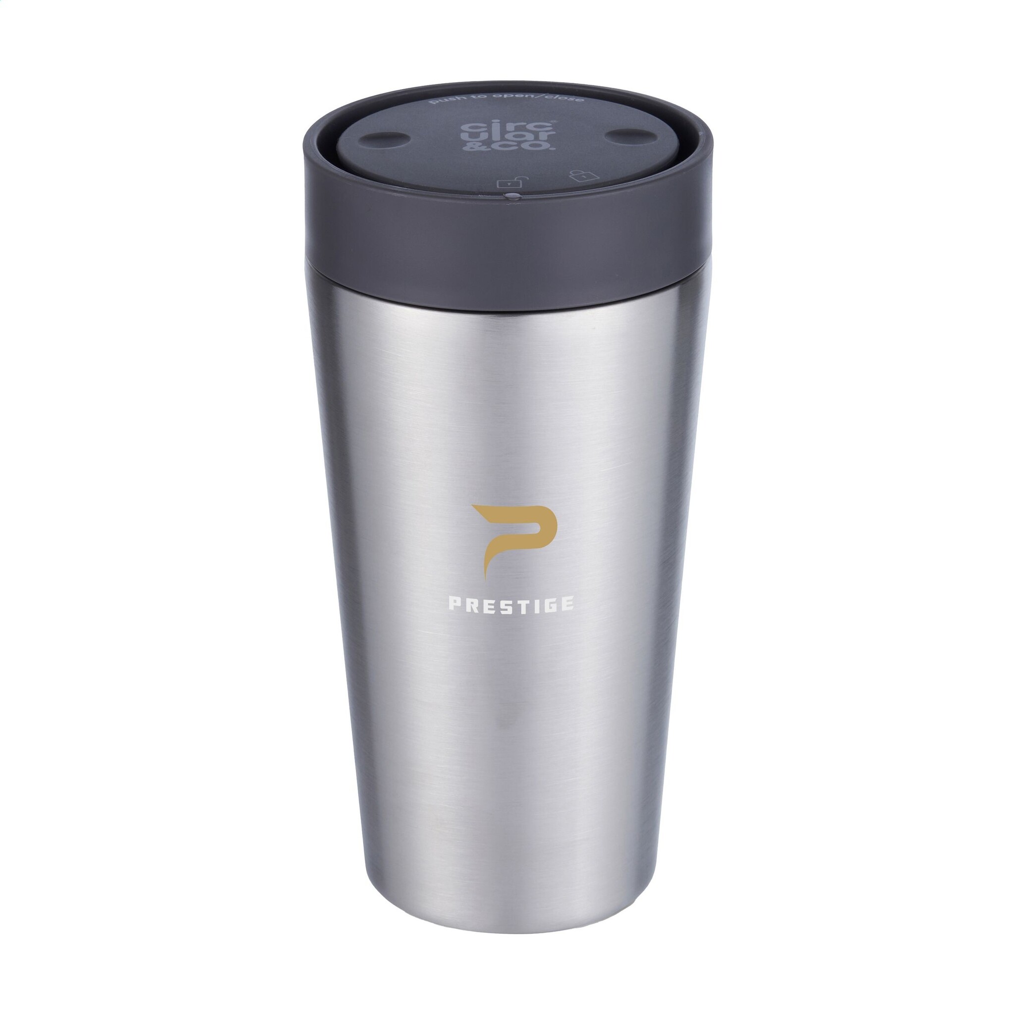 Dubbelwandige, herbruikbare koffie to-go thermosbeker met deksel, van Circular&Co. De beker is gemaakt van 98% gerecycled RVS. Het deksel is van PP en 100% recyclebaar. Door de isolerende werking blijft je drank lang op temperatuur. Het deksel van deze koffiebeker heeft bijzondere innovatieve kenmerken zoals een trust-lock™ mechanisme en een swift-click™ sluiting. Druk het deksel in om te drinken. Klik op het deksel om de beker af te sluiten en draai het deksel op slot. Dit doe je gemakkelijk met één hand. Daarnaast heeft het deksel een duidelijke open- en dichtpositie voor een nóg betere 360-graden drinkervaring, waarmee je vanuit elke hoek kunt drinken. Deze ideale cup is dus 100% lek- en morsvrij en ideaal voor onderweg. BPA-vrij, Melaminevrij en Food Approved. Inclusief gebruiksaanwijzing. Inhoud 340 ml. Per stuk in doos.
