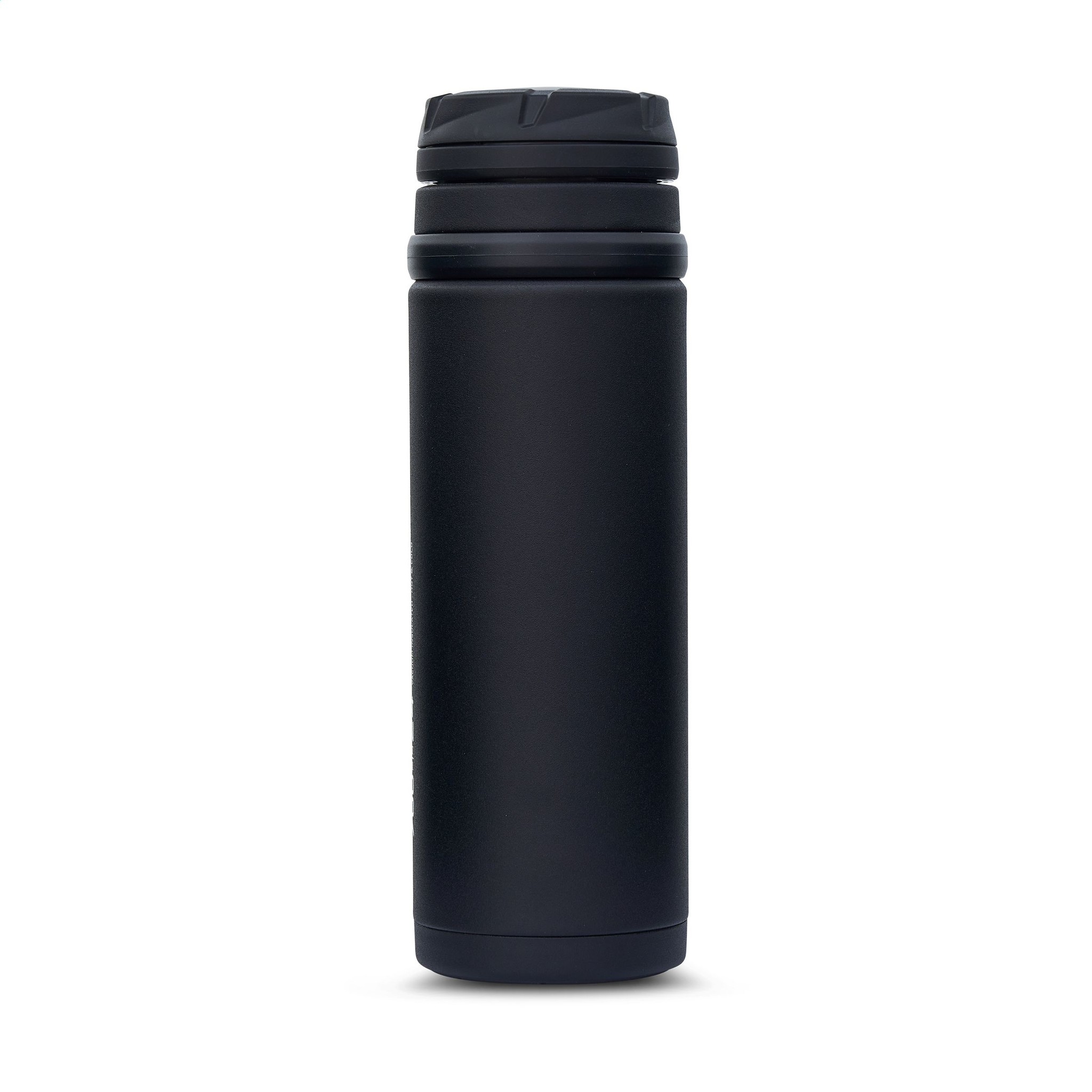 De fles is afgewerkt met een gripvaste poedercoating en voorzien van een antislipbodem voor extra stabiliteit. De royale drinkopening maakt vullen en schoonmaken eenvoudig, terwijl de praktische draaidop met rubberen draaglus stevig aan de fles blijft hangen.