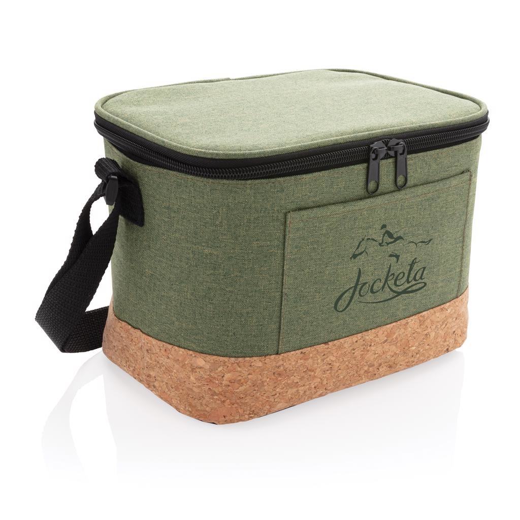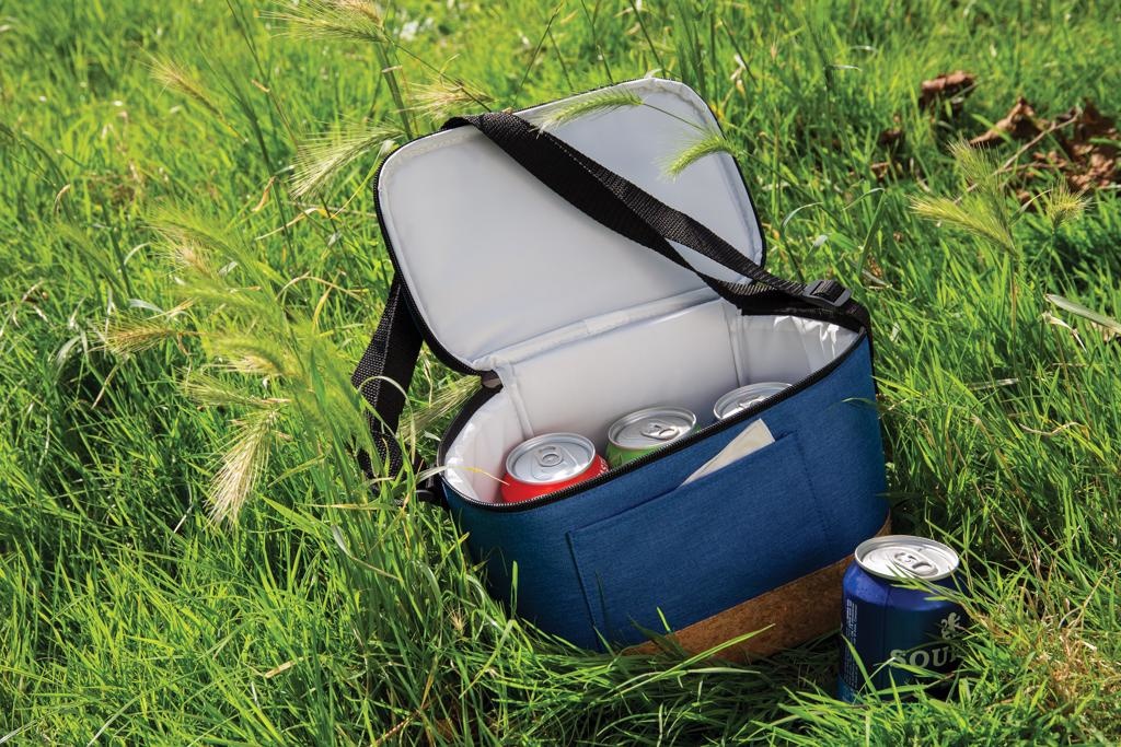 Formaat: 22 x 15 x 16,5 cm. Materiaal: textiel met kurkdetail. Eigenschappen: koelvak, tweekleurig design, verstelbare schouderriem, geschikt voor 6 blikjes. Gebruik: lunch, evenementen, promoties en dagelijks gebruik. Personalisatie: bedrukking met logo via zeefdruk transfer met drukformaat 90 x 50 mm, tot 6 kleuren.