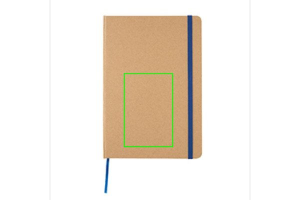 Formaat: 21 x 14,4 x 1,1 cm. Materiaal: kraftpapier en gerecycled papier. Inhoud: 72 vellen, 144 gelinieerde pagina’s, 70 g/m² papier. Eigenschappen: elastieksluiting, bladwijzerlint, crèmekleurig papier. Gebruik: notities, vergaderingen, trainingen, kantoor. Personalisatie: bedrukking met logo op de omslag.