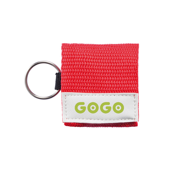 Formaat: 5,5 x 2 x 5 cm. Materiaal: PP masker met metalen sleutelhanger. Eigenschappen: mond-op-mond beademingsmasker, rode etui met velcro sluiting, sleutelhanger bevestiging, EN 13485:2003 gecertificeerd. Gebruik: BHV, EHBO, auto, reizen en werkplekken. Personalisatie: tampondruk op de etui met een drukformaat van 35 x 10 mm.