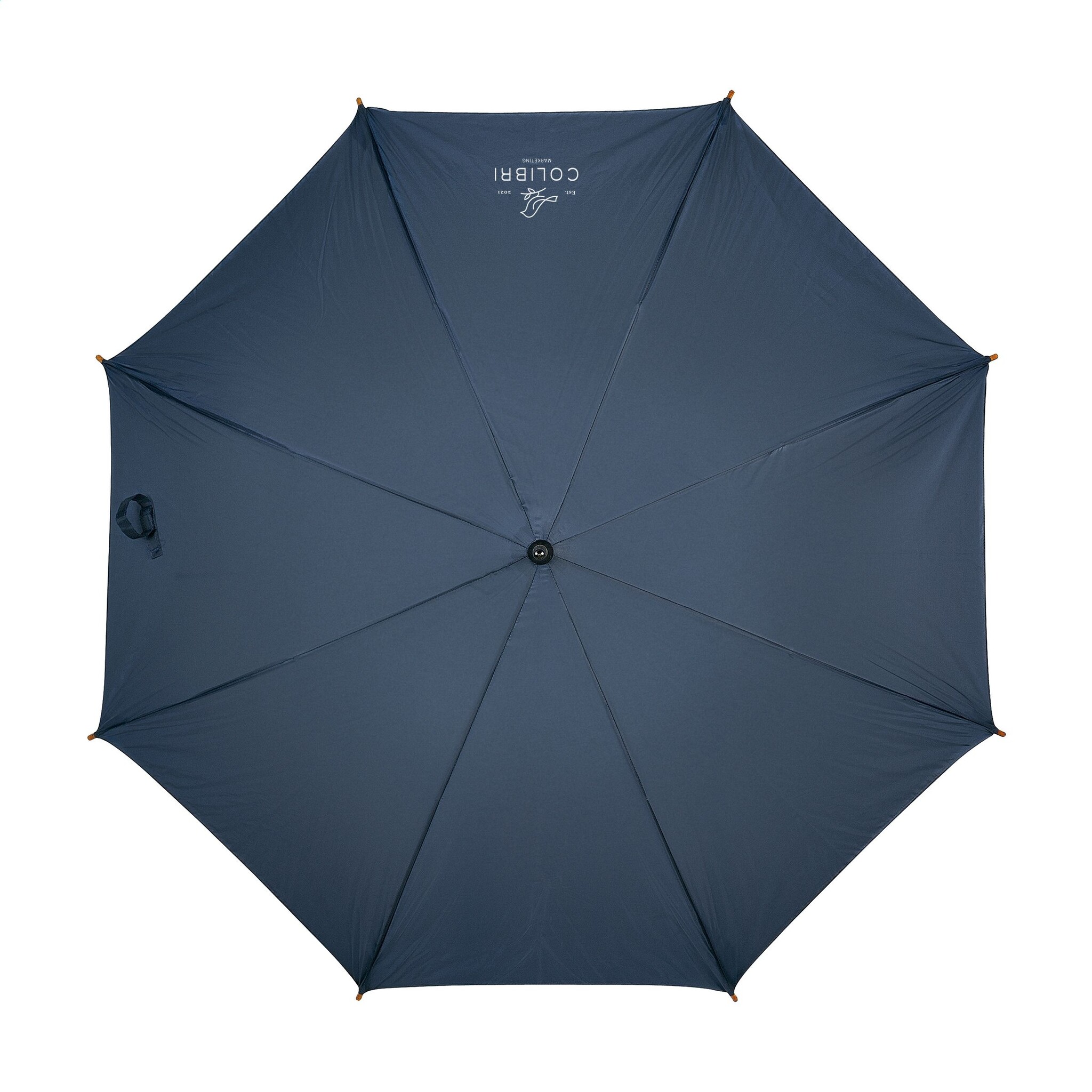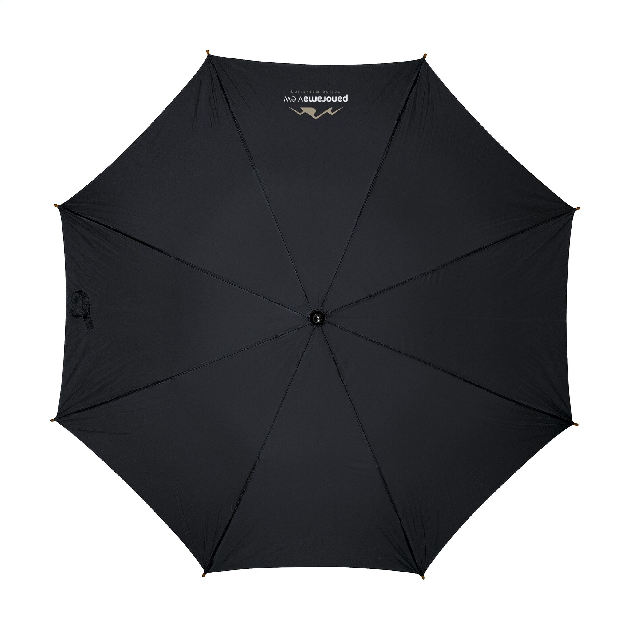 WoW! Paraplu met automatische telescoopvering, 190T RPET pongee bespanning, metalen frame, houten steel en handgreep en klittenbandsluiting. RCS-gecertificeerd. Totaal gerecycled materiaal: 15%.