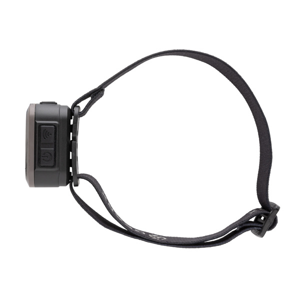 Formaat: 52 x 38 x 36 mm. Materiaal: RCS-gecertificeerd gerecycled ABS. Eigenschappen: COB- en LED-verlichting, lichtopbrengst tot 250 lumen, bereik tot circa 70 meter, zes lichtmodi inclusief SOS, IPX4 waterdicht en stofbestendig, verstelbare hoofdband, oplaadbare 800 mAh lithiumbatterij, gebruiksduur tot circa 3 uur, USB-C oplaadbaar. Gebruik: professioneel werk, onderhoud, outdooractiviteiten en noodsituaties. Personalisatie: bedrukken met logo op de behuizing, afhankelijk van ontwerp.