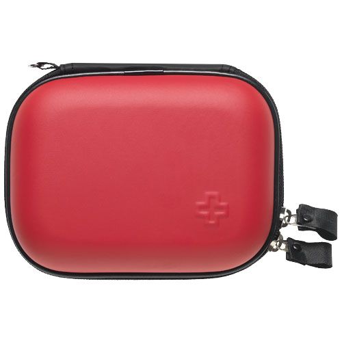Formaat: circa 13 x 10,5 x 4,8 cm. Materiaal: EVA hoes. Eigenschappen: compacte 16-delige EHBO-set met alcoholdoekjes, non-woven spons, zelfklevende pleisters, papiertape, verband, schaar, veiligheidsspelden en mitella. Gebruik: geschikt voor thuis, kantoor, reizen, auto en sportactiviteiten. Personalisatie: bedrukken met logo mogelijk op de voorzijde van de hoes.