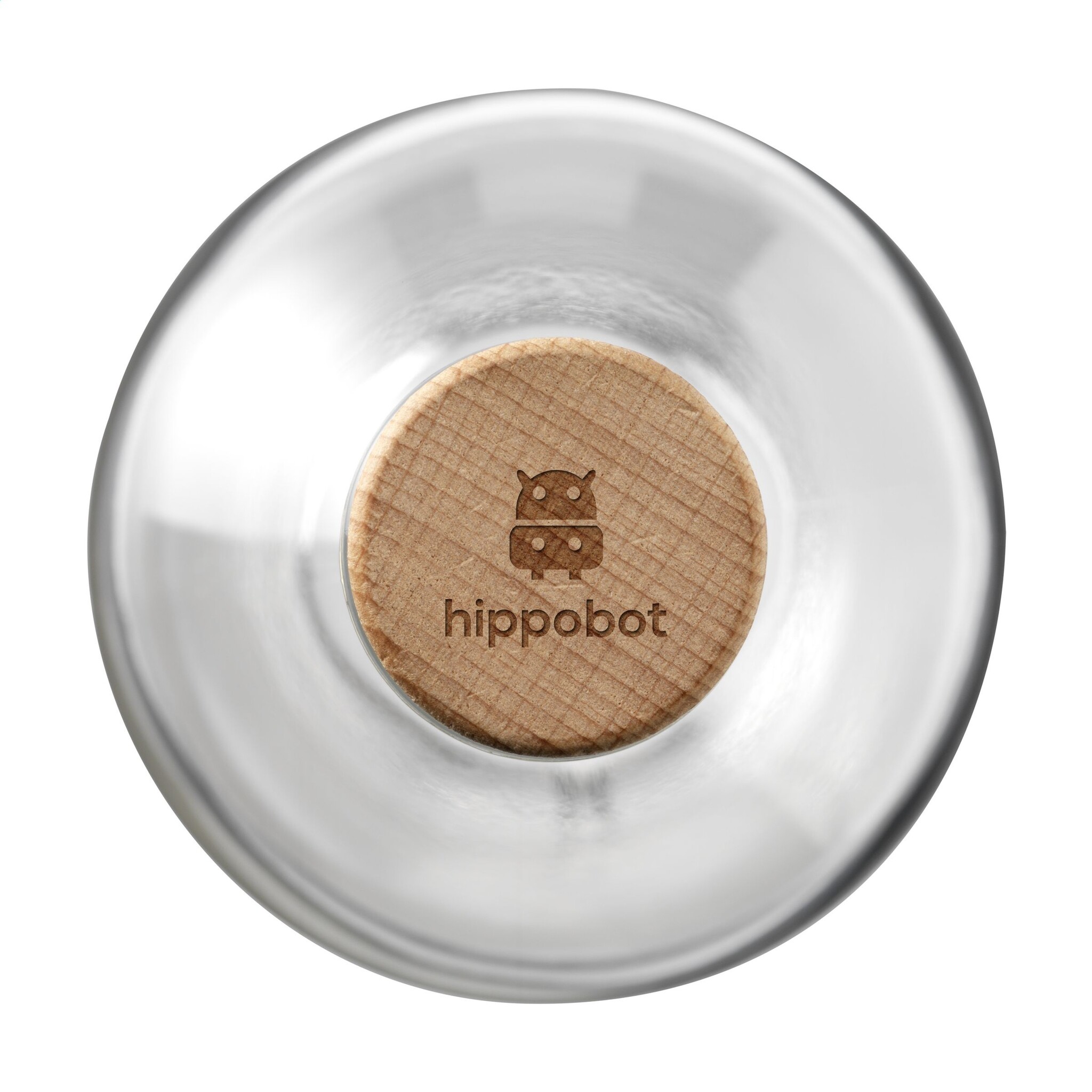 De fles is voorzien van een stevige bodem en een houten dop met synthetische kurk, die voor een betrouwbare afsluiting zorgt. Het glas is volledig vaatwasserbestendig, terwijl de dop met kurk met de hand dient te worden gereinigd om de levensduur te verlengen. Voor flessen met bedrukking wordt handwas aangeraden om de opdruk optimaal te behouden.
