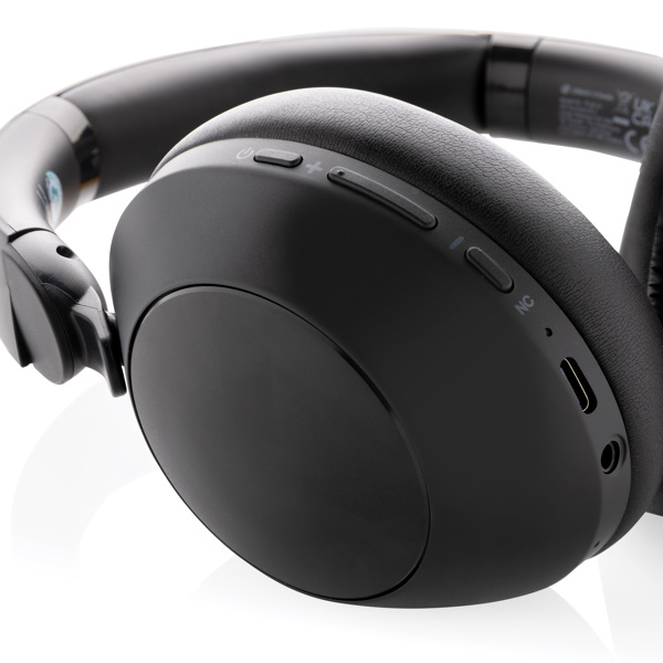 Afmeting: 16,8 x 8 x 19,2 cm | Materiaal: RCS-gecertificeerd gerecycled ABS en PU | Eigenschappen: over-ear ontwerp, Active Noise Cancelling tot 25 dB, opvouwbaar en lichtgewicht | Bluetooth: versie 5.3, bereik tot 10 meter | Batterij: afspeeltijd tot 50 uur, oplaadtijd ca. 3 uur via USB-C | Extra’s: microfoon, gespreksaanname, meegeleverde buidel | Personalisatie: bedrukking met logo | Verpakking: plastic gereduceerd