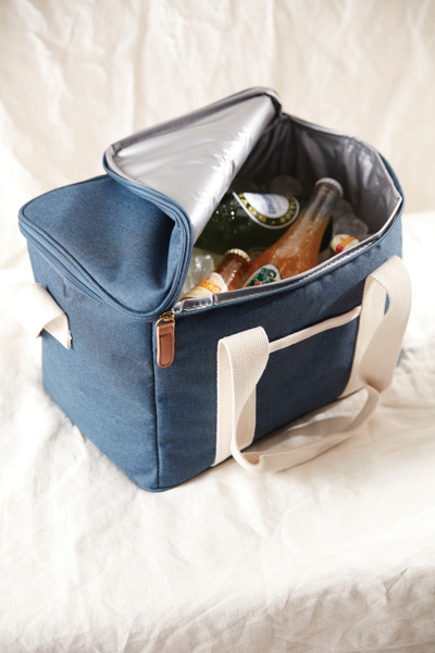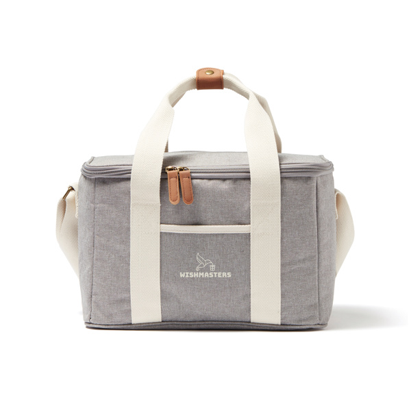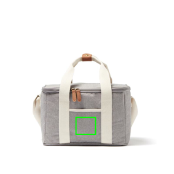 Formaat: 32 x 21 x 21 cm. Materiaal: RPET met katoen en imitatieleer details. Eigenschappen: 50 procent gerecycled PET, dikke EVA isolatie, extra buitenvak, verstelbare schouderband, dubbele handgrepen, eenvoudig reinigbaar. Gebruik: picknick, strand, events en outdoor promoties. Personalisatie: zeefdruk transfer op de voorzijde met drukformaat 70 x 60 mm.