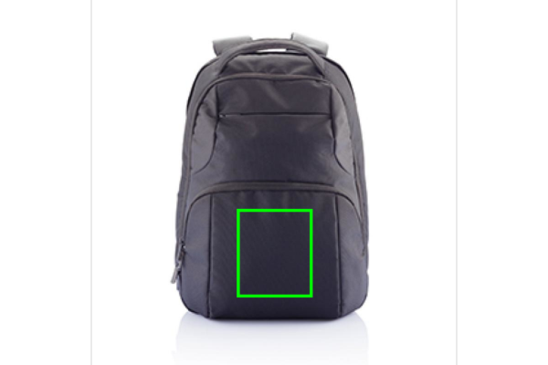 Formaat: 12 × 44 × 32 cm | Materiaal: 1200D gerecycled RPET polyester | Eigenschappen: 2 hoofdvakken, laptopvak 15,6 inch, voorvakken met rits, PVC-vrij | Gebruik: Werk, reizen en dagelijks gebruik | Personalisatie: Bedrukken met logo mogelijk via zeefdruk transfer, drukformaat 120 × 140 mm