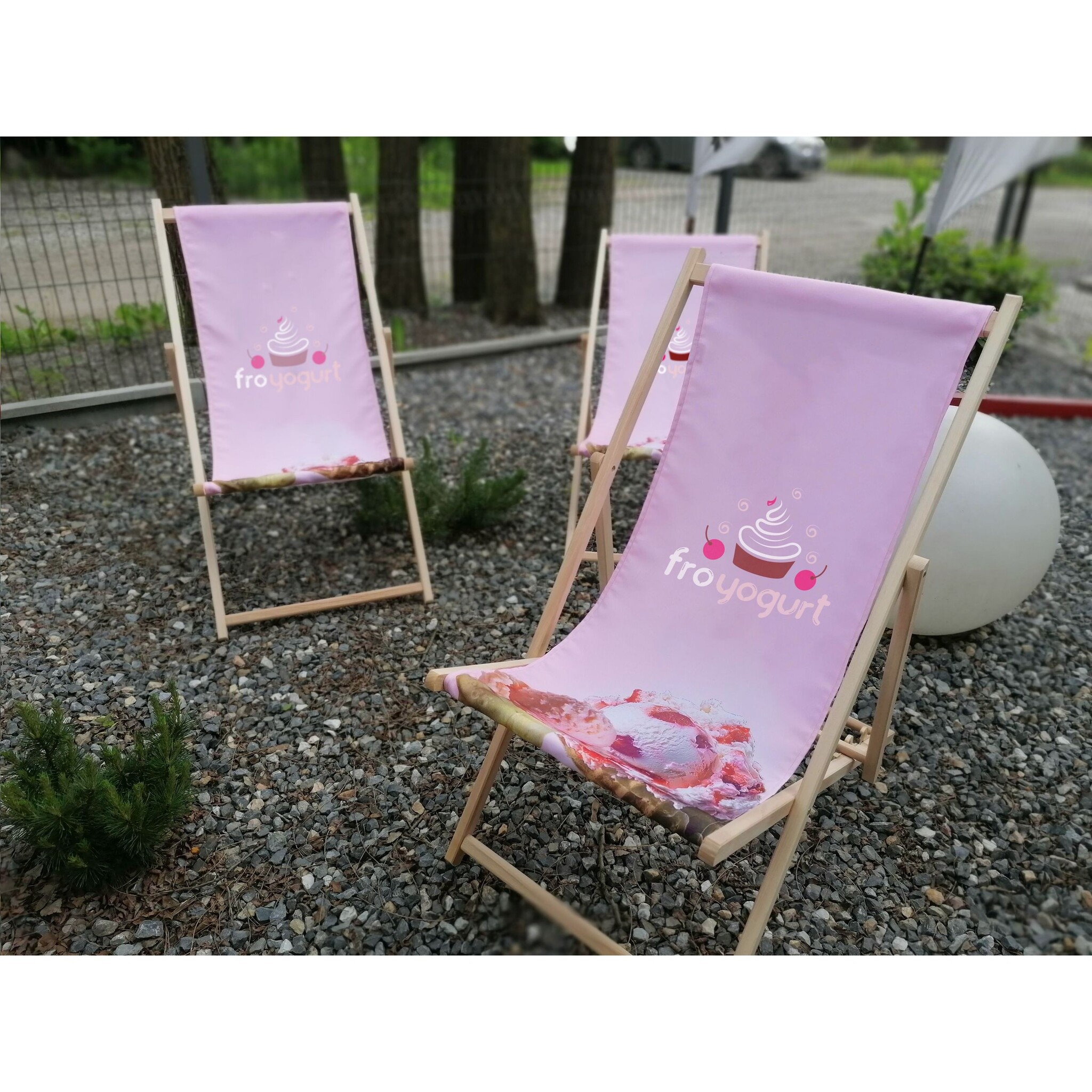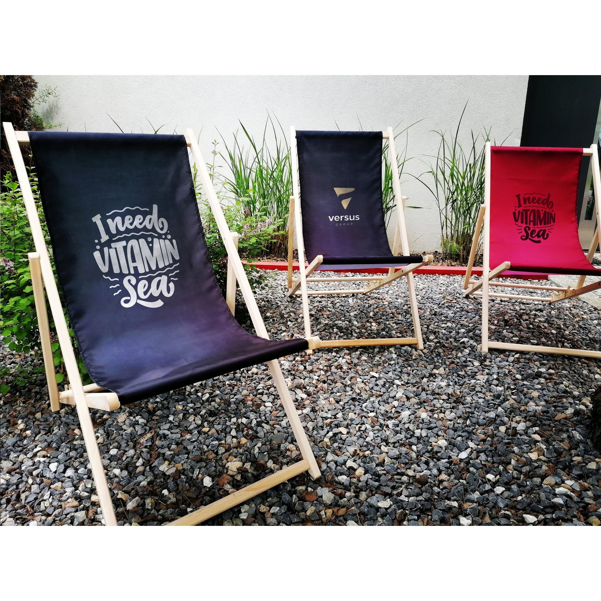Strandstoel met beukenhouten frame en 100% RPET polyester doek. Het frame is verstelbaar in 3 standen. Maximum draaggewicht 120 kg. Uw logo d.m.v. sublimatie op de bovenzijde van het doek. Made in Europe.