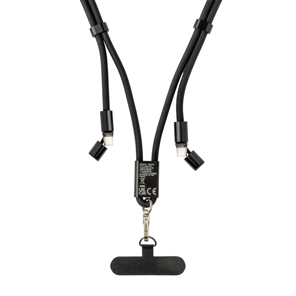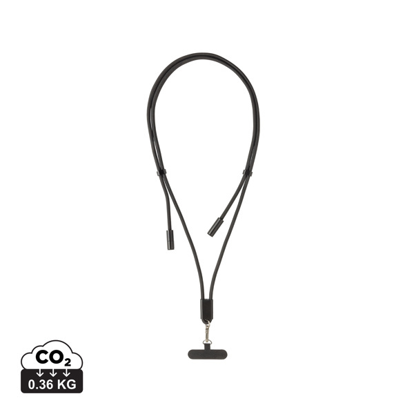 Eigenschappen: Verstelbaar draagkoord van 160 cm, 84 procent gerecycled materiaal, geïntegreerde USB-C kabel met 60W snelladen, datafunctie, PVC-vrij