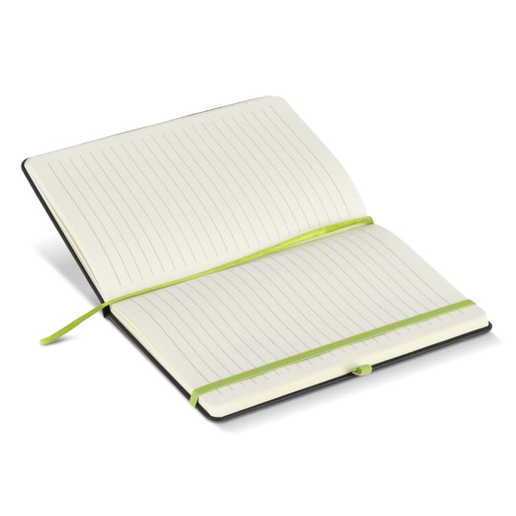 Formaat: 140 x 17 x 210 mm Materiaal: PU Eigenschappen: geschikt voor lasergravure, elastische sluiting, leeslint, penlus, hardcover omslag Papier: 96 gelinieerde vellen, 70 g/m² Gebruik: kantoor, meetings en dagelijks gebruik Personalisatie: lasergravure met logo mogelijk