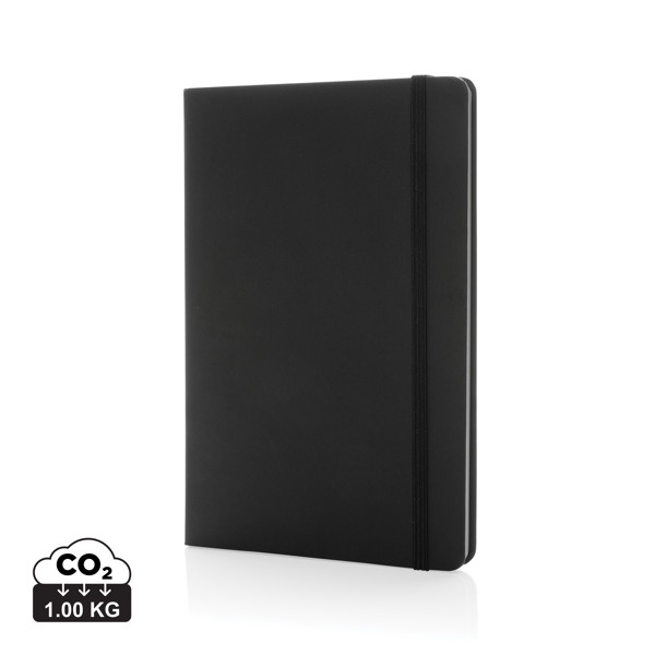 Formaat: 21,3 x 14,2 x 1,1 cm. Materiaal: FSC kraftpapier en steenpapier. Inhoud: 160 gelinieerde pagina’s, 120 g/m². Eigenschappen: elastieksluiting, bladwijzerlint, duurzame materiaalcombinatie. Gebruik: notities, vergaderingen, trainingen, kantoor. Personalisatie: bedrukking met logo op de omslag.