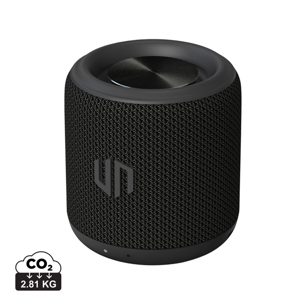 Formaat: 5,8 x 5,8 x 6 cm. Materiaal: gerecycled ABS en gerecycled PET. Eigenschappen: draadloze 3W speaker met geïntegreerde subwoofer, lange speeltijd tot circa 17 uur bij 50 procent volume, compact en lichtgewicht ontwerp. Gebruik: muziek luisteren op kantoor, thuis, onderweg of tijdens evenementen. Personalisatie: lasergravering op de speaker met een drukformaat van 25 x 25 mm.