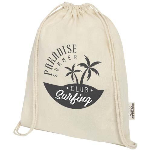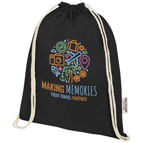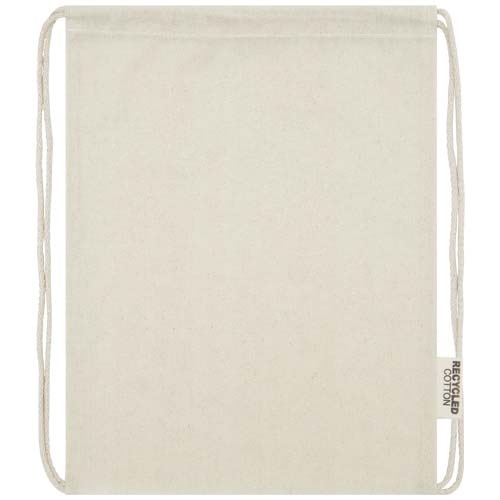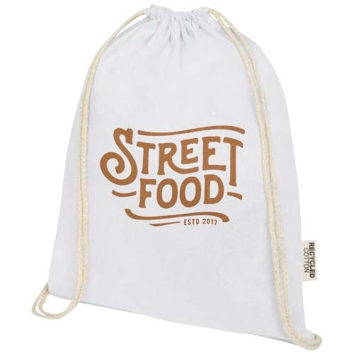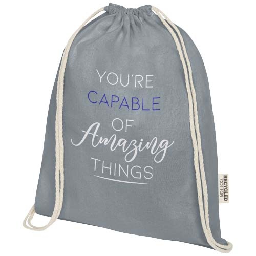 De Oregon tas met trekkoord van 100% GRS-gecertificeerd gerecycled katoen is gemakkelijk uit te delen als geschenk om je merk of marketingcampagne te promoten. Deze lichte tas is budgetvriendelijk, gemakkelijk op de rug of op de schouder te dragen en biedt voldoende ruimte voor het toevoegen van een logo of andere boodschappen. Dankzij het trekkoord is de tas gemakkelijk te openen en te sluiten, en het katoenmateriaal van 140 g/m² is sterk en duurzaam. Groot hoofdvak met katoenen trekkoordsluiting. Geschikt voor een gewicht tot 5 kg.