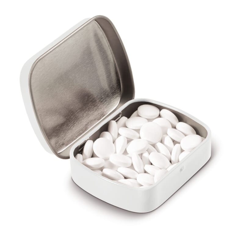 Dit rechthoekige pepermuntblikje straalt eenvoud, degelijkheid en professionaliteit uit en is daarmee een sterk promotieartikel voor bedrijven die zichtbaar willen blijven op een stijlvolle manier. Dankzij het stevige metalen ontwerp met scharnierdeksel is het blikje duurzaam in gebruik en geschikt voor herhaald vullen, waardoor jouw merk langdurig onder de aandacht blijft.