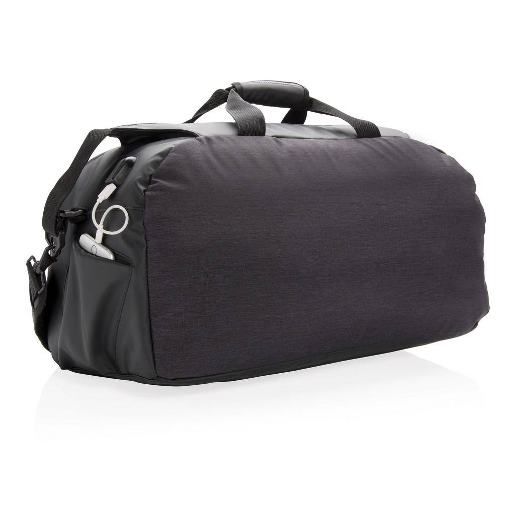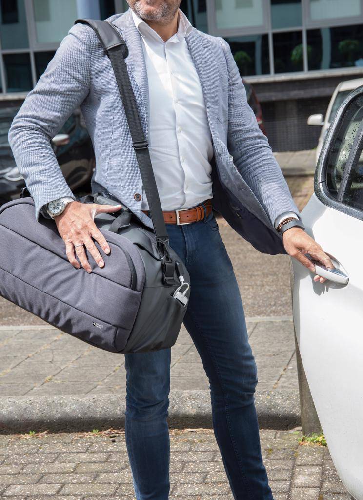 Uniek ontwerp weekendtas met een groot hoofdvak en een voorvak. Sluit uw powerbank makkelijk aan op de geïntegreerde USB-laadpoort en laad de telefoon of tablet op onderweg. Met telefoon of waterflessen vak aan de buitenzijde en handige kaarthouder in schouderriem.