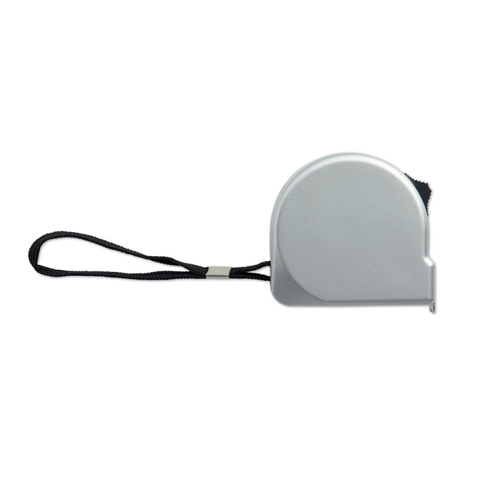 Specificaties: Afmeting 6 x 5,5 x 2,3 cm, vervaardigd uit ABS, meetlengte 2 meter, mat zilveren behuizing, voorzien van polsband en glanzend zilverkleurige metalen clip. Bedrukking mogelijk met een drukformaat van 53 x 53 mm op de voorzijde.