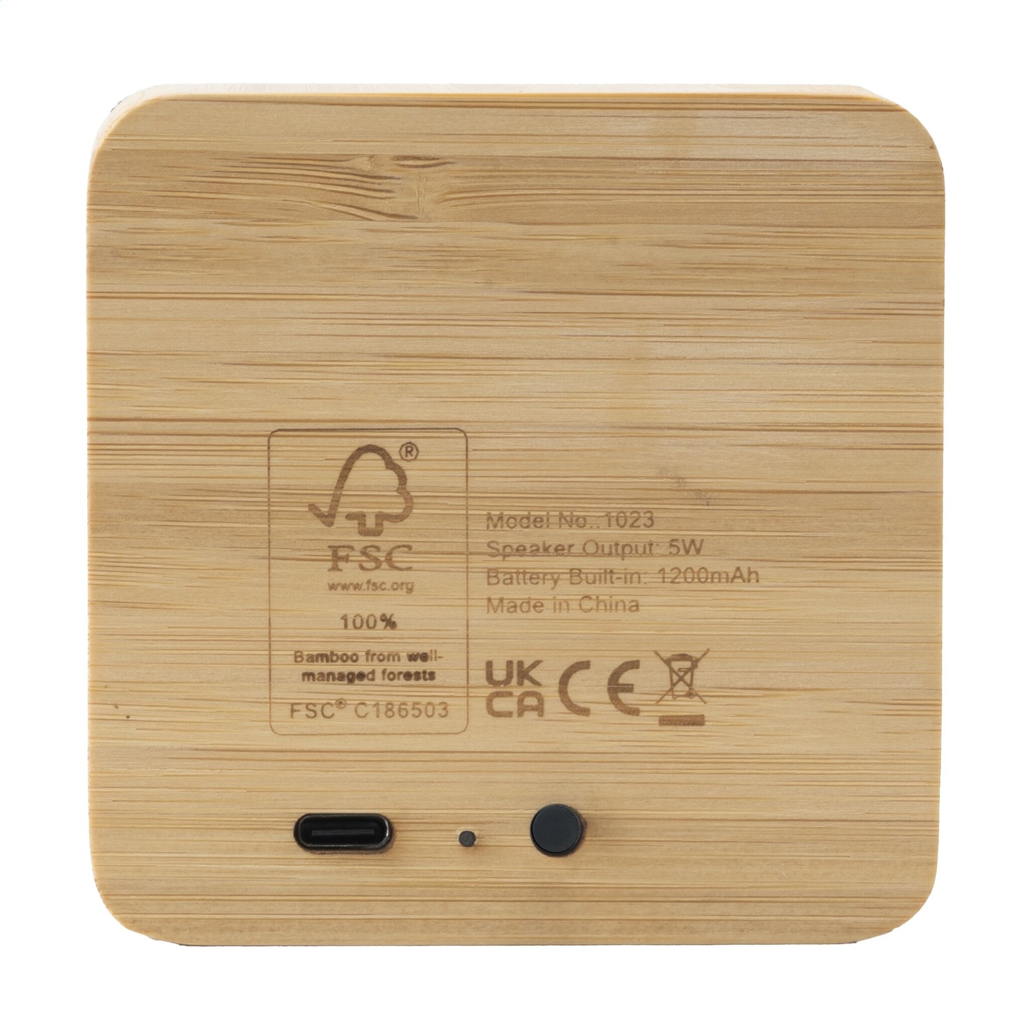 Bluetooth 5W draadloze speaker. De behuizing is gemaakt van natuurlijk, FSC® gecertificeerd bamboe en heeft een speakerdoek van RPET. Met een vermogen van 5W produceert de speaker een goed, helder geluid. De ingebouwde, oplaadbare 1200mAh Li-ion batterij staat, eenmaal opgeladen, garant voor een speelduur van maximaal 6 uur (volume op 75%). Draadloos bereik tot 10 meter. Eenvoudig te bedienen en compatible met de meest gangbare smartphones en tablets. Output: 5W. Inclusief oplaadkabel met USB-C aansluiting en gebruiksaanwijzing. Per stuk in kraft doos.