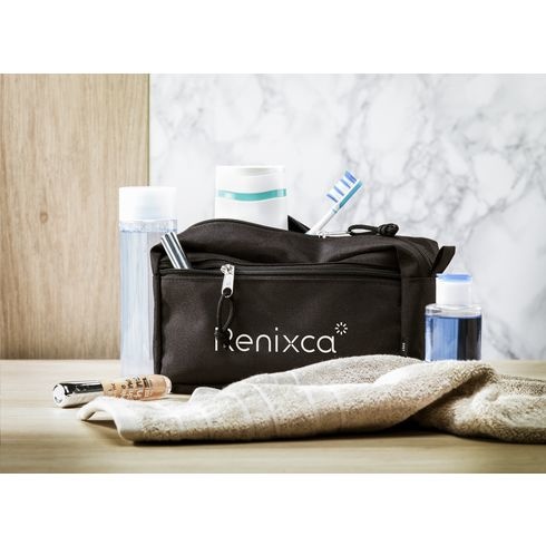 Royale toilettas van 600D RPET polyester vervaardigd uit gerecyclede PET-flessen en textielvezels, voorzien van ophanglus en extra ritsvak, geschikt voor bedrukking via zeefdruk.