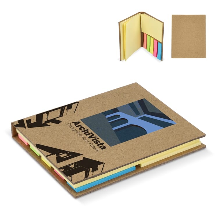 Formaat: 102 x 82 x 10 mm. Materiaal: kraftpapier omslag met papier. Inhoud: drie formaten sticky notes, totaal 200 vellen. Eigenschappen: duurzaam uiterlijk, meerdere formaten, compact en overzichtelijk. Gebruik: notities, markeringen, meetings en dagelijkse kantoororganisatie. Personalisatie: bedrukken met logo op het kraft omslag.
