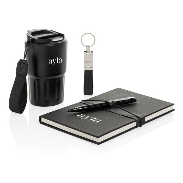 Formaat: 36 x 24 x 10 cm. Materiaal: gerecycled RVS, gerecycled papier, PU. Inhoud set: vacuüm koffiemok 350 ml, soft-touch notitieboek 160 pagina’s, business balpen, premium sleutelhanger. Eigenschappen: dubbelwandig geïsoleerd, lekvrij, RCS-gecertificeerd. Personalisatie: bedrukken met logo op meerdere items.