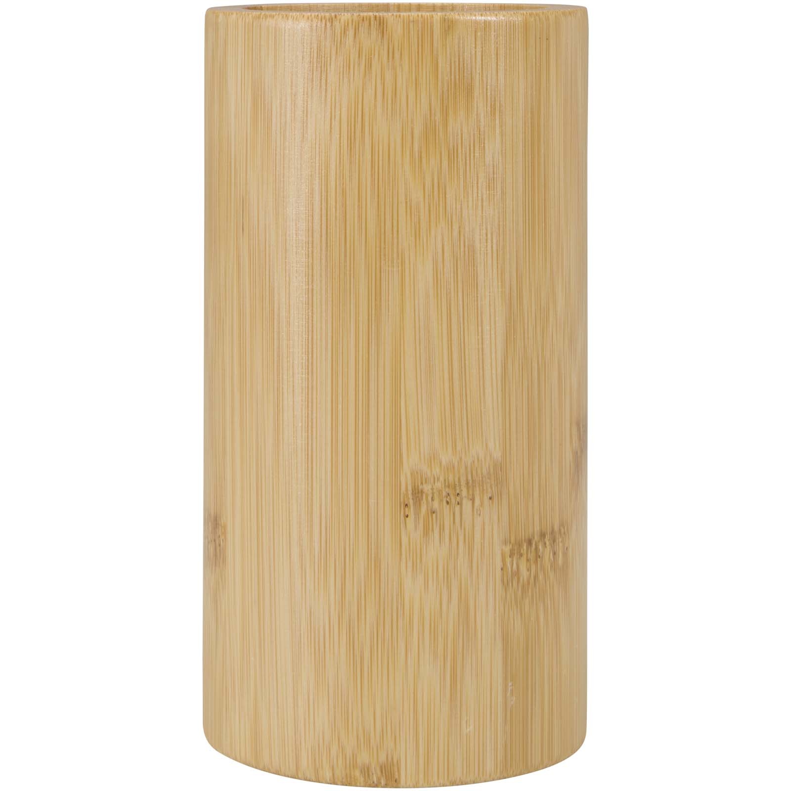 Afmeting houder: ca. 30 x Ø 8 cm | Materiaal: bamboe | Inhoud set: lepel 29,8 x 5,8 cm, sleuflepel 29,8 x 5,8 cm, spatel 30,3 x 6,1 cm, sleufspatel 30 x 6 cm, geperforeerde spatel 30 x 6 cm | Dikte gereedschap: 0,8 cm | Eigenschappen: duurzaam, lichtgewicht en geschikt voor anti-aanbak pannen | Gebruik: dagelijks koken en bakken | Personalisatie: lasergraveren | Verpakking: bulk