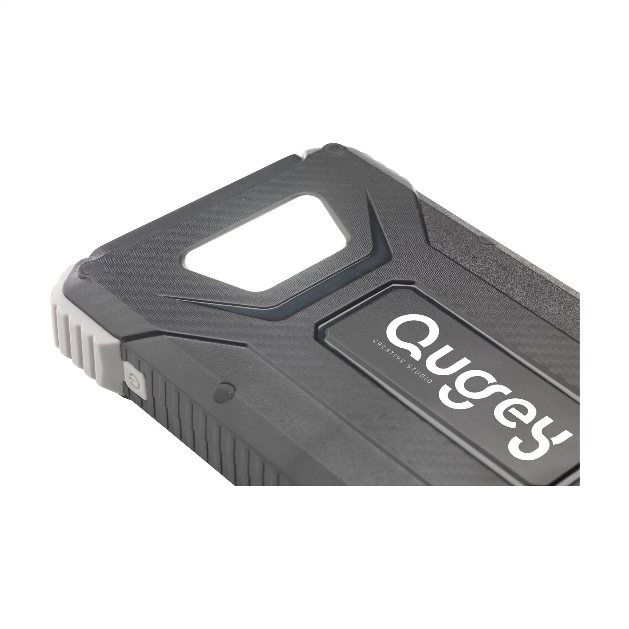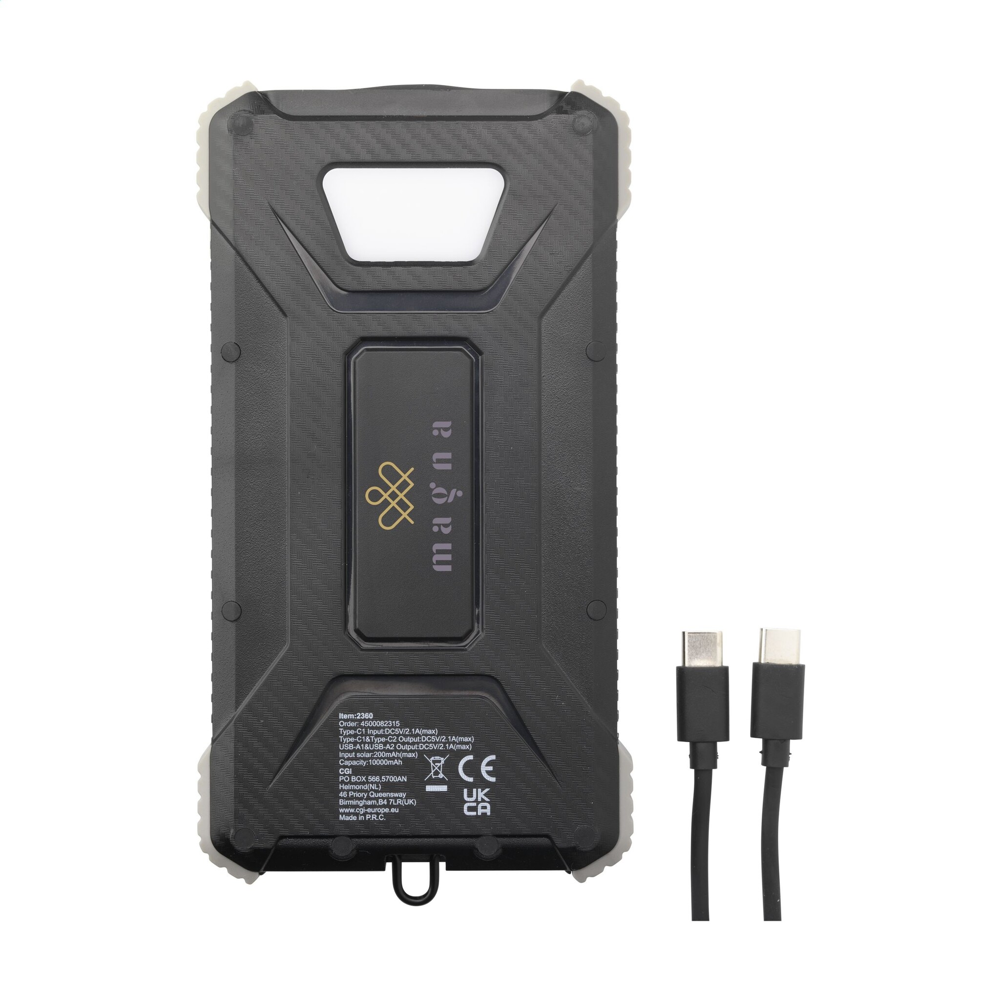 Stoere outdoor powerbank van gerecycled ABS met beschermende siliconen stootranden op de hoeken. De powerbank beschikt over een solar panel, LED-indicatielampjes, LED-zaklamp en inklapbaar ophangoog. Spatwaterdicht en stofbestendig, geschikt voor het opladen van de meest gangbare smartphones en andere devices. Input: Type-C1 DC5V/2.1A. Output: DC 5V/2A. Voorzien van 2 USB-A poorten en 2 USB-C poorten. Input solar: 100 mAh, oplaadtijd op zonne-energie circa 50 uur. Inclusief USB-C/USB-C oplaadkabel en gebruiksaanwijzing. RCS-gecertificeerd, totaal gerecycled materiaal 20%. Per stuk in doosje.