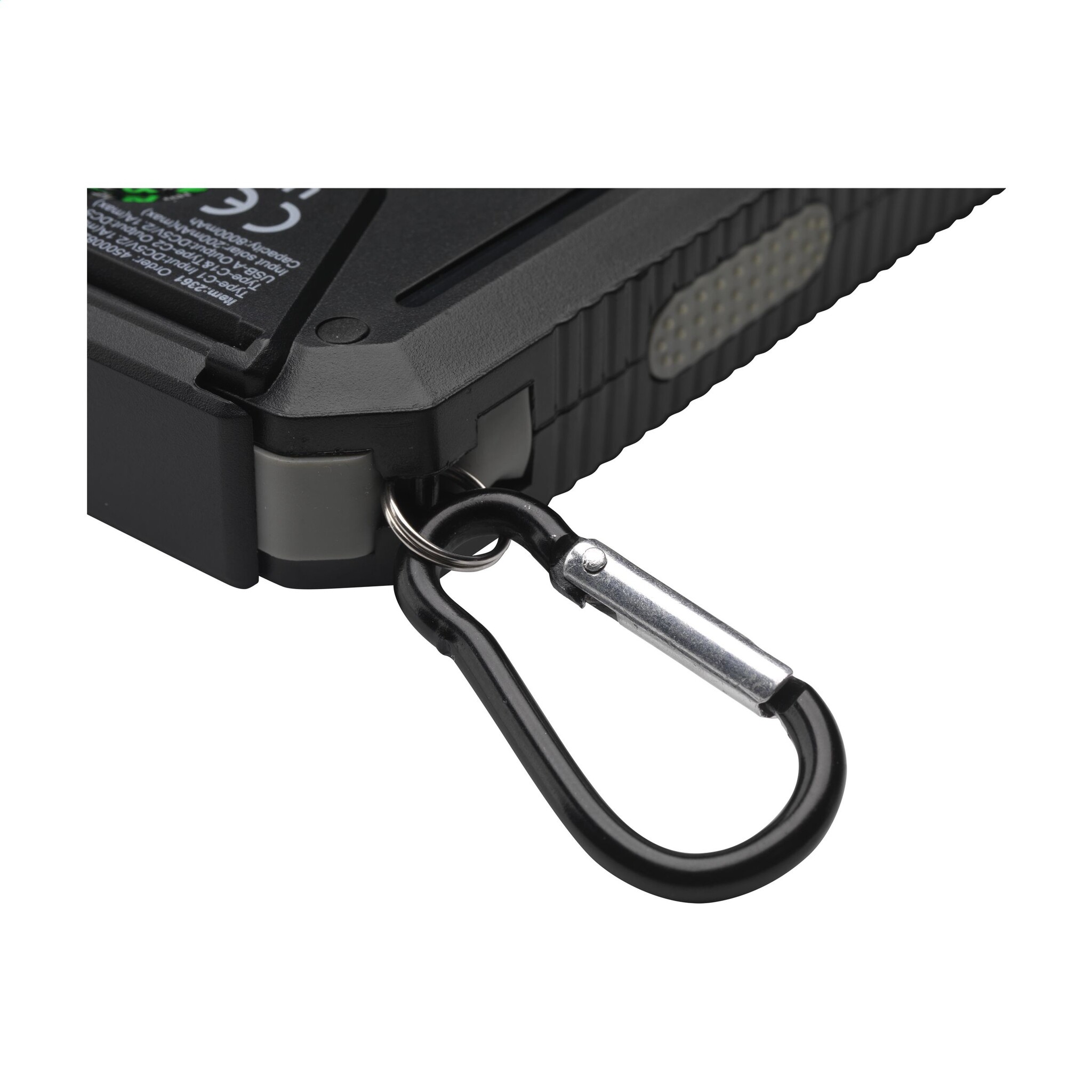 Stoere outdoor powerbank van gerecycled ABS met beschermende siliconen stootranden op de hoeken. Voorzien van een solar panel, geïntegreerd kompas, LED-indicatielampjes, LED-zaklamp en karabijnhaak. Spatwaterdicht en stofbestendig, geschikt voor het opladen van de meest gangbare smartphones en andere devices. Input: Type-C DC5V/2.1A. Output: Type-C DC5V/2.1A. Voorzien van 1 USB-A poort en 2 USB-C poorten. Input solar: 200 mAh, oplaadtijd op zonne-energie circa 40 uur. Zowel via het stroomnet als via het zonnepaneel op te laden. Inclusief USB-C/USB-C oplaadkabel en gebruiksaanwijzing. RCS-gecertificeerd, totaal gerecycled materiaal 17%. Per stuk in doosje.