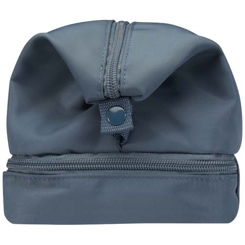 De toilettas is gemaakt van 290D twill polyester met een gebreide achterkant en gevoerd met RPET 210D/PU, wat zorgt voor duurzaamheid en stevigheid. Binnenin vind je een hoofdcompartiment met ritsvak voor kleinere items. Het onderste vak in schelpvorm maakt het mogelijk om essentiële spullen apart te houden, waardoor je altijd snel toegang hebt tot wat je nodig hebt.