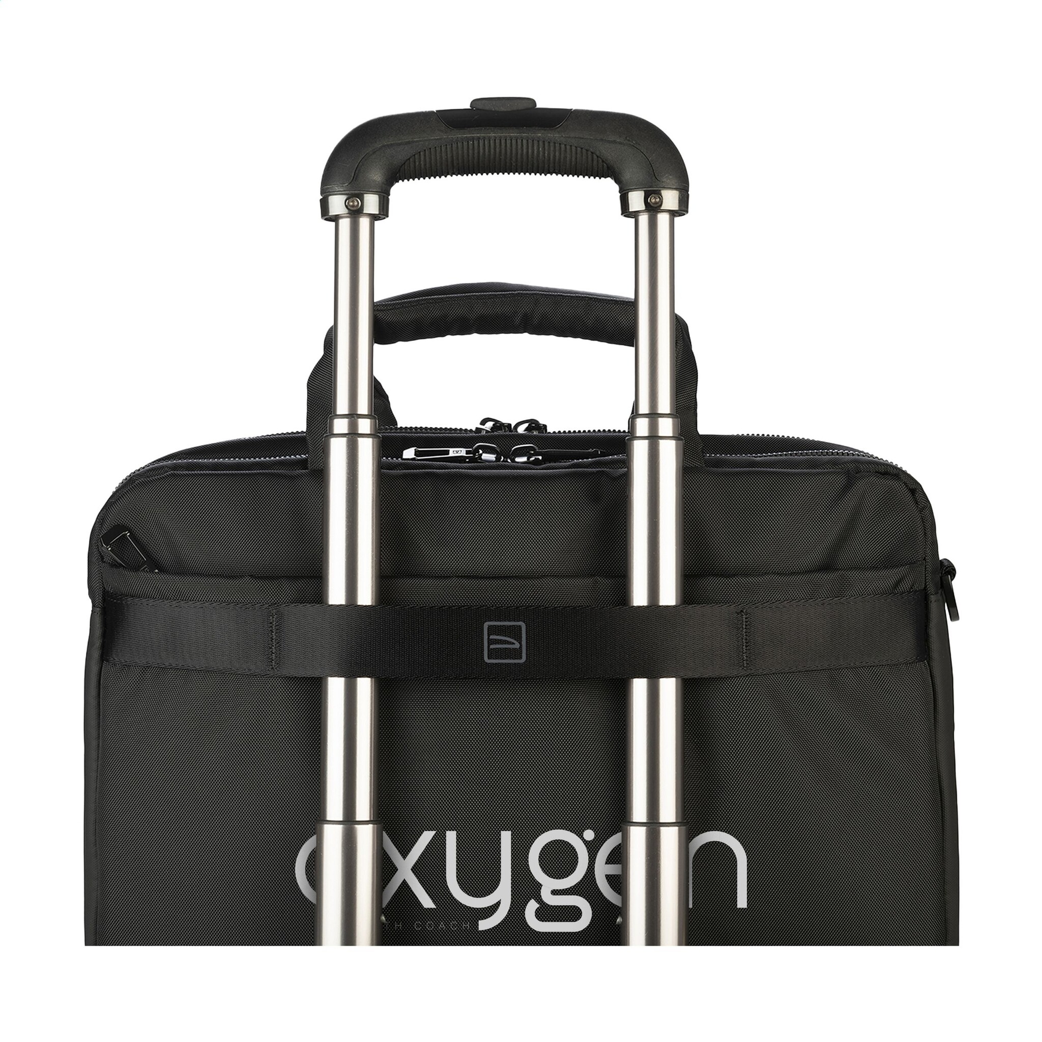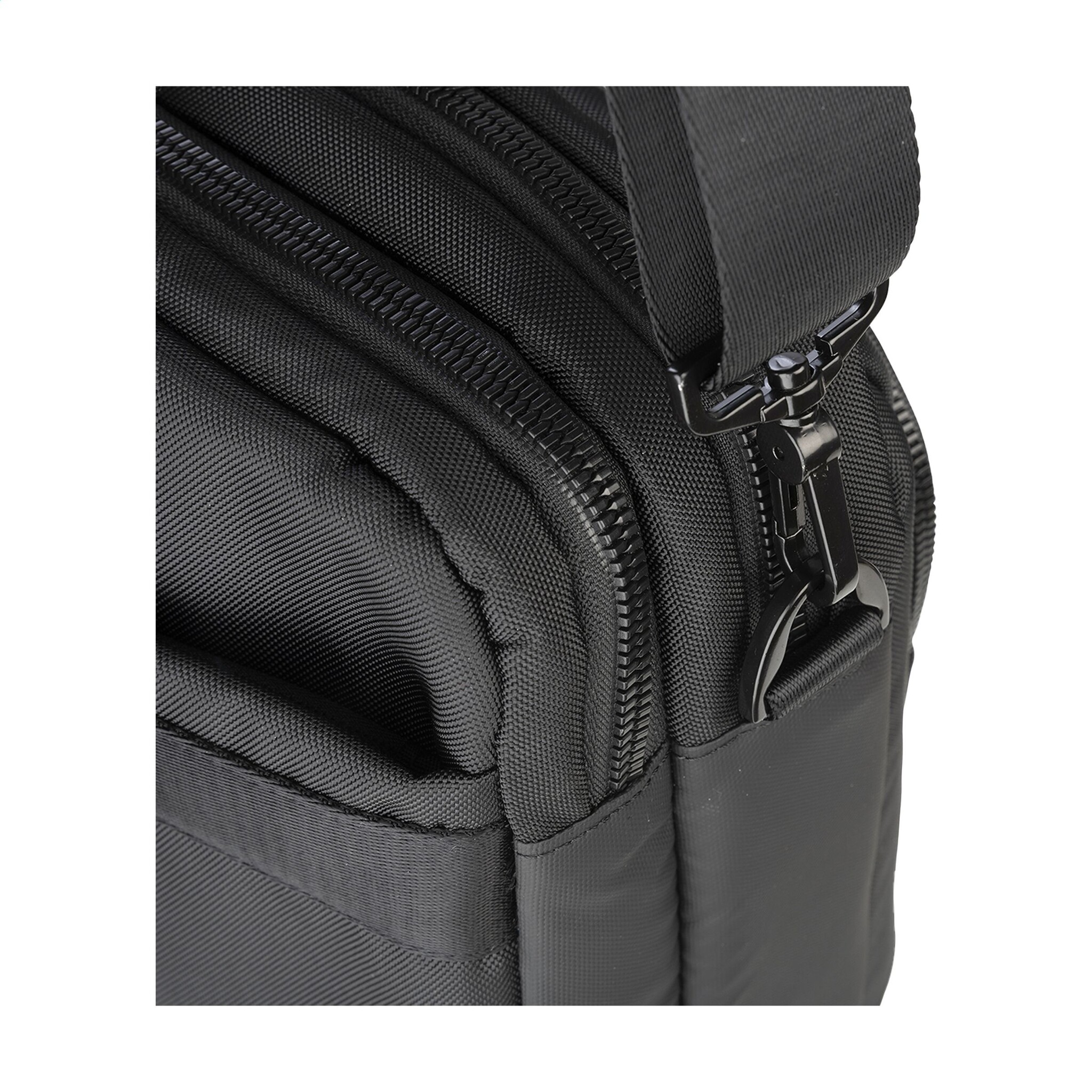 Extra: Voorvak met organiser, achtervak met ritssluiting, verstelbare en afneembare schouderriem, dubbele gewatteerde handgreep