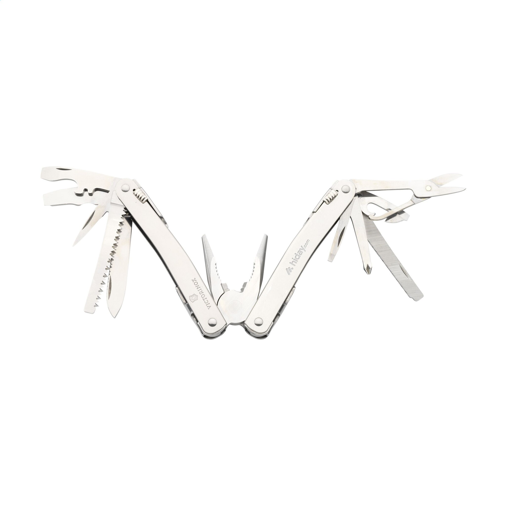 Tot de functies behoren onder meer een punttang, draadtang voor zachte en harde draad, groot mes, blikopener, flesopener, meerdere schroevendraaiers, schaar, houtzaag, metaalzaag, metaalvijl, priem, kabelsnijders en draadstripper. Daarnaast beschikt de multitool over handige extra’s zoals een trekhaak, koordoog, koppelstuk voor kurkentrekker en draagclip.