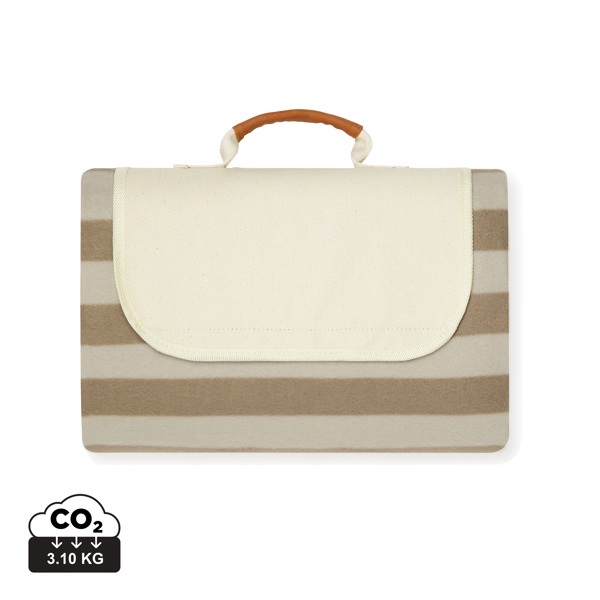Formaat: 170 x 130 x 0,5 cm. Materiaal: GRS-gecertificeerd RPET fleece en PEVA onderzijde. Eigenschappen: waterafstotend, opvouwbaar, canvas en kunstleren details, 56% gerecycled materiaal. Gebruik: picknicks, outdoor events, festivals en relatiegeschenken. Personalisatie: borduring met drukformaat 80 x 79 mm.
