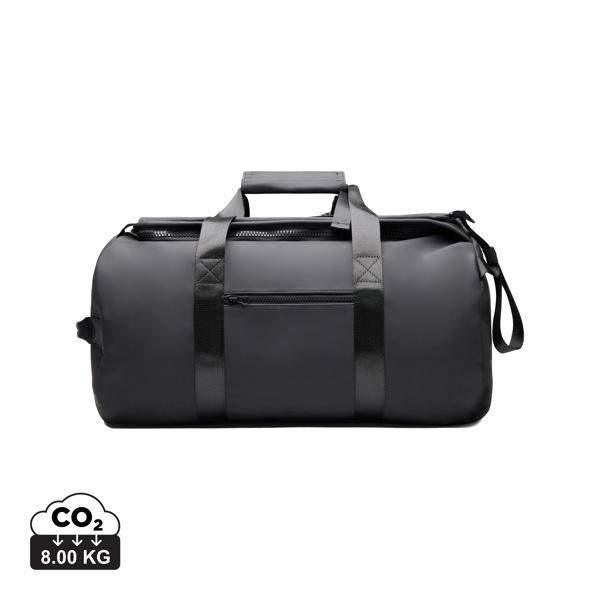 De tas is vervaardigd uit RCS-gecertificeerd gerecycled polyester in combinatie met PU en bevat drieëntwintig procent gecontroleerd gerecycled materiaal volgens de Recycled Claim Standard. Dat garandeert een transparante keten en een bewuste materiaalkeuze zonder concessies aan uitstraling of stevigheid. Met zijn royale formaat is de tas geschikt voor weekendtrips, sportmomenten, zakelijke overnachtingen en als dagelijkse extra tas. Personalisatie via zeefdruk transfer maakt de tas tot een zichtbare, duurzame merkdrager met professioneel karakter. Ondersteund door onze ervaring sinds 1972 en standaard artikel op voorraad.