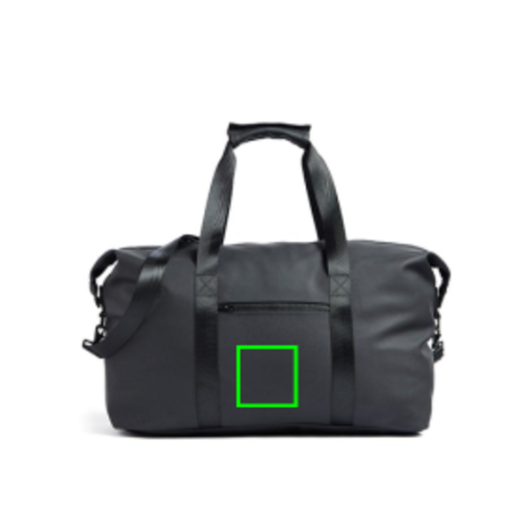 Formaat: 55,5 x 22 x 43 cm. Materiaal: polyester met nubuck PU-look afwerking. Eigenschappen: ruim hoofdvak, verstelbare schouderriem, ritsvak aan de zijkant, extra vak met drukknop, waterafstotende afwerking. Gebruik: weekendtrips, zakelijke reizen en overnachtingen. Personalisatie: zeefdruk transfer op de voorzijde met een drukformaat van 100 x 100 mm.