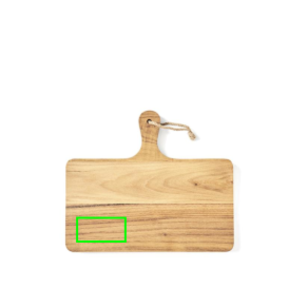Personalisatie is mogelijk via CO₂-gravering, de meest gekozen techniek voor dit product. Door gravering direct in het hout ontstaat een subtiele en duurzame merkvermelding die perfect aansluit bij het natuurlijke karakter van teakhout. Met een graveerformaat tot 80 x 40 mm komt een logo of boodschap stijlvol en blijvend tot zijn recht, zonder afbreuk te doen aan het design.