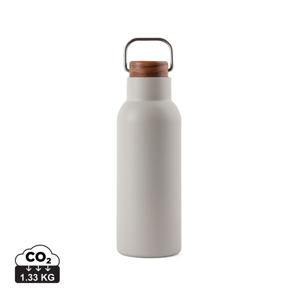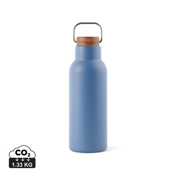 Formaat: 22 x Ø 7,5 cm. Materiaal: RCS-gecertificeerd gerecycled RVS en acaciahout. Eigenschappen: dubbelwandige vacuümisolatie, houdt warm en koud op temperatuur, 76 procent gerecycled materiaal, houten deksel met metalen draaglus, handwas aanbevolen, FSC kraftverpakking. Gebruik: werk, reizen en dagelijks gebruik. Personalisatie: bedrukken of graveren met logo op de fles.