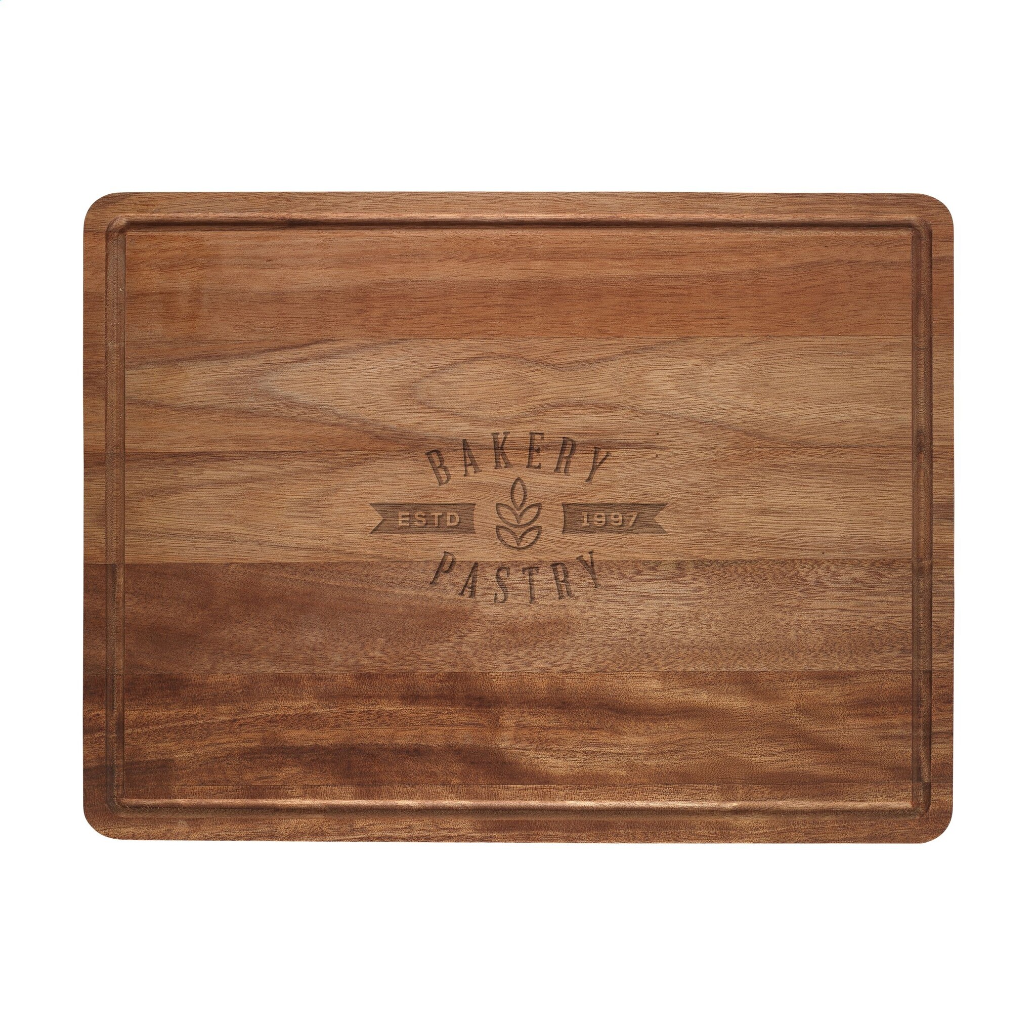 De Wooosh Gustoso snijplank is een robuuste en stijlvolle keukenhulp, vervaardigd uit FSC® 100% gecertificeerd acaciahout. Dankzij de praktische, rondlopende groef worden vlees- en vruchtensappen netjes opgevangen, zodat het werkblad schoon blijft.