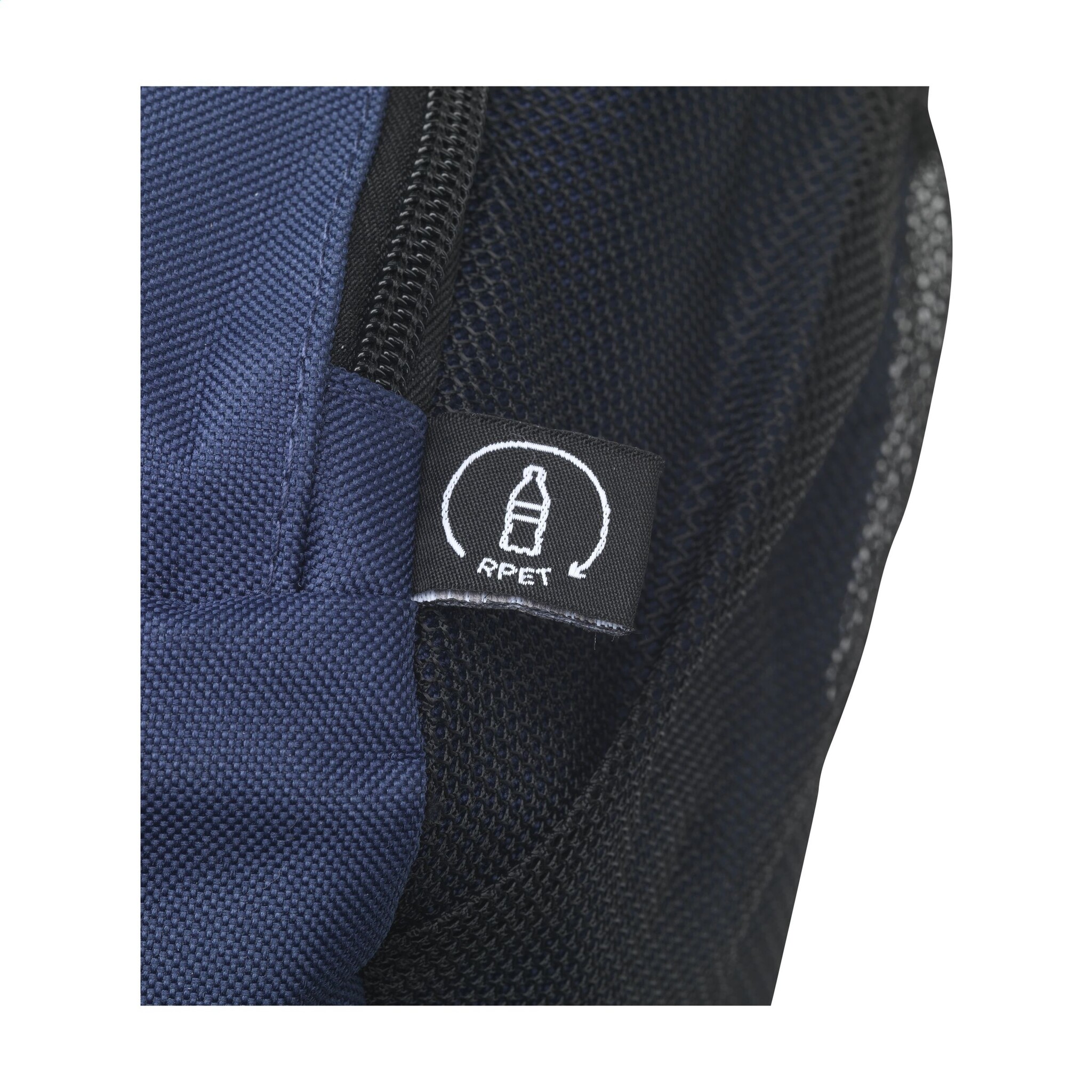 Rugzak van stevig RPET polyester. Een smal model met een royaal compartiment met ruimte voor het veilig vervoeren van een laptop tot 15,6 inch. Met extra ritsvak aan de voorzijde en een meshvak aan beide zijdes. De verstelbare schouderriemen en het achterpaneel zijn bekleed met mesh stof en voorzien van foam voor extra draagcomfort. De verstelbare schouderriemen hebben extra lussen en een band om de riemen op hun plaats te houden tijdens het dragen. Met stevige ritsen, volledig gevoerd en keurig afgewerkt. Een compacte rugzak met verrassend veel ruimte. GRS-gecertificeerd. Totaal gerecycled materiaal: 92%. Inhoud ca. 12 liter.