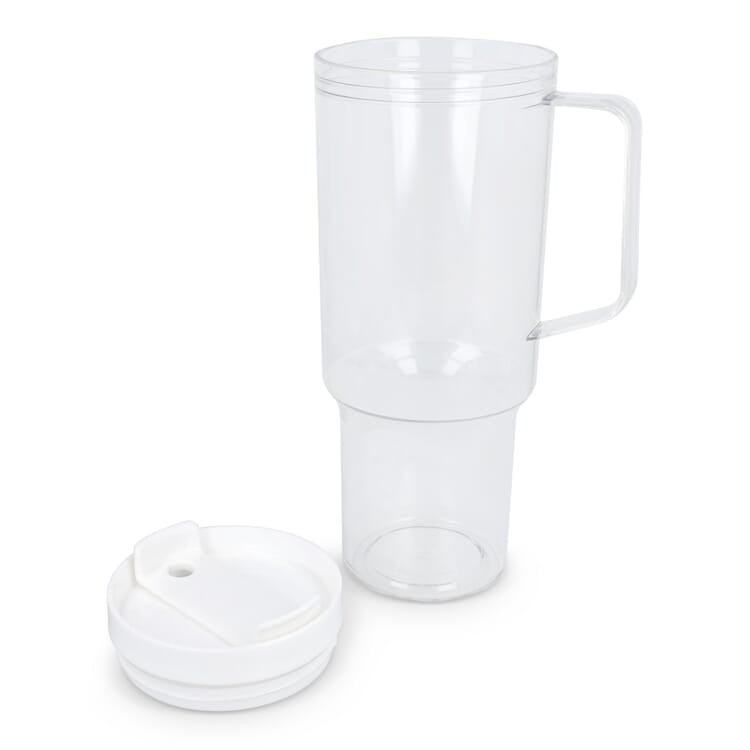 De beker is gemaakt van R-PET, een gerecycled kunststof materiaal dat bijdraagt aan een duurzamere keuze. Het transparante ontwerp geeft de beker een moderne en frisse uitstraling, terwijl het stevige handvat zorgt voor extra gebruiksgemak.